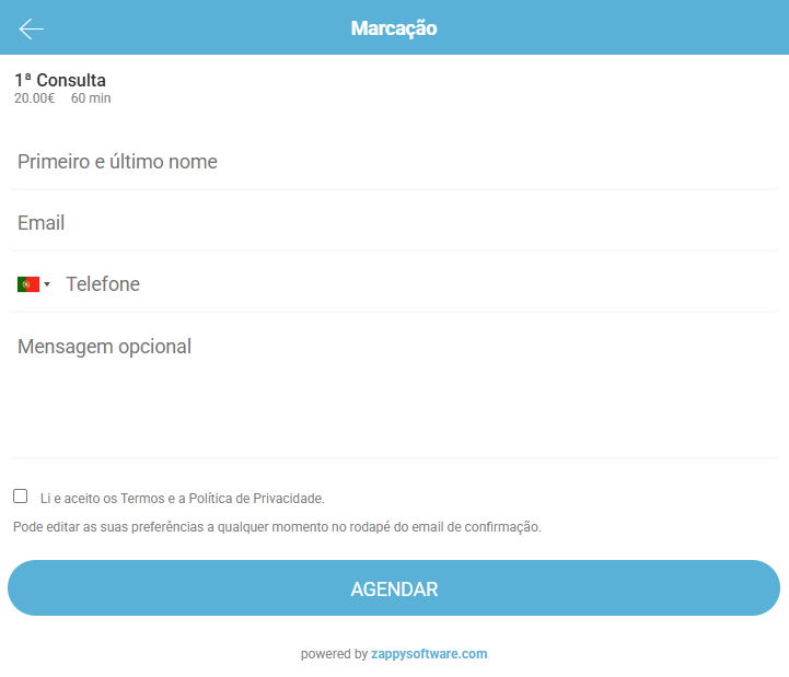 Quando um cliente efetua uma marcação, é necessário preencher os seguintes dados obrigatórios: