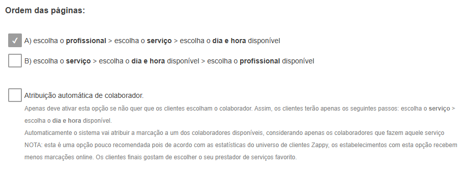 A opção de atribuição automática de colaborador é pouco recomendada pois de acordo com as estatísticas da plataforma Zappy, os estabelecimentos com esta opção recebem menos marcações online. Conclui-se que os clientes preferem escolher o seu prestador de serviços favorito.