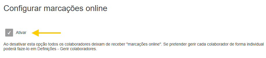 Ao desativar esta opção, todos os colaboradores deixam de receber marcações online.